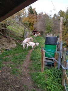 Mit meinem Saanenbock Elvis habe ich derzeit im wahrsten Sinne des Wortes etwas zu „kämpfen“, denn bei mir als zwangsläufig selbsternanntem „Geburtenregler vom Kleinpaßlerhof“ haben die Decksaison und die Zuordnung der passenden Ziegen zum Bock meiner Wahl soeben begonnen. Leider vernebelt der überbordende Testosteronspiegel (ähnlich seinem zweibeinigen ehemaligen Rock’n’Roll-Legenden-Namensvetter aus Amerika … 😉) total das Bockgehirn und ich werde nicht mehr als „guter Futterbringer“, sondern als „böser Konkurrent“ von ihm gesehen.