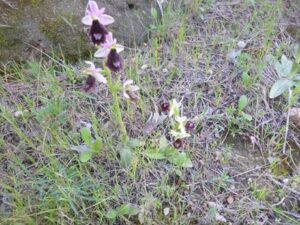 Balearen-Ragwurz (Ophrys balearica), eine nur auf den Balearen vorkommende (Fachausdruck: endemische) Orchidee, in der Garigue von Ibiza